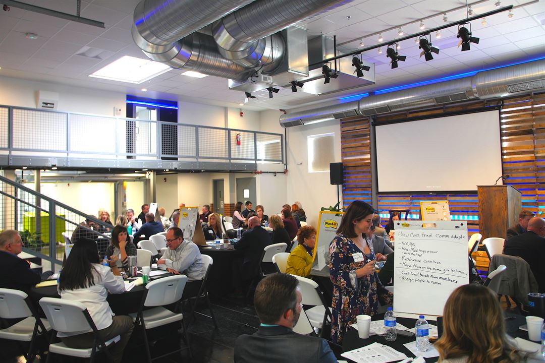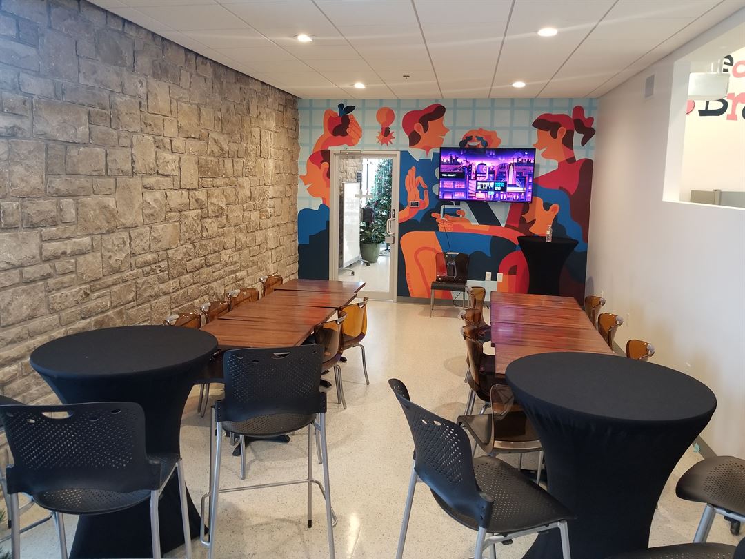 The Event Space is versatile and configurable to make every event easy and memorable. Surrounding the center platform is an open floor plan that can be arranged for a variety of offsite events, including retreats, presentations, trainings, banquets, competitions, trade shows, and more. The Event Space comes equipped with an HDTV, projector, AV equipment, configurable seating, moveable furniture and whiteboards.