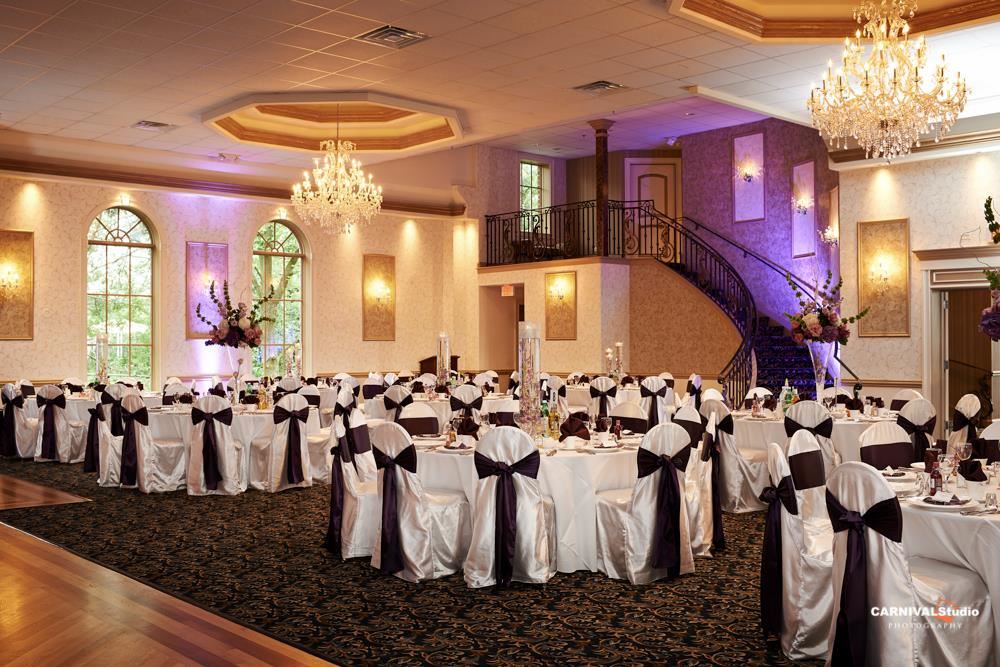 This elegant reception hall with crystal chandeliers creates a sophisticated and romantic setting for your event. A marble fireplace and outdoor fountain sets the perfect backdrop for your pictures. A winding staircase leads to a private bridal suite. Menu options include family style and plated dinners that are prepared on site. With many years of experience in the banquet business, we will service every detail of your special event to make it an unforgettable experience.