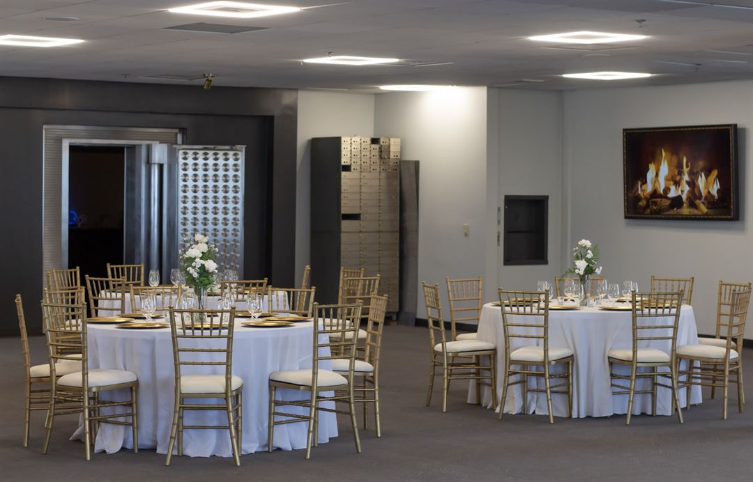Our beautifully designed 18,000 square foot former bank holds up to 350 guests and includes a ballroom, separate ceremony space, two luxurious prep suites, an entertainment room, a gorgeous vault bar, lounge area and a catering kitchen.