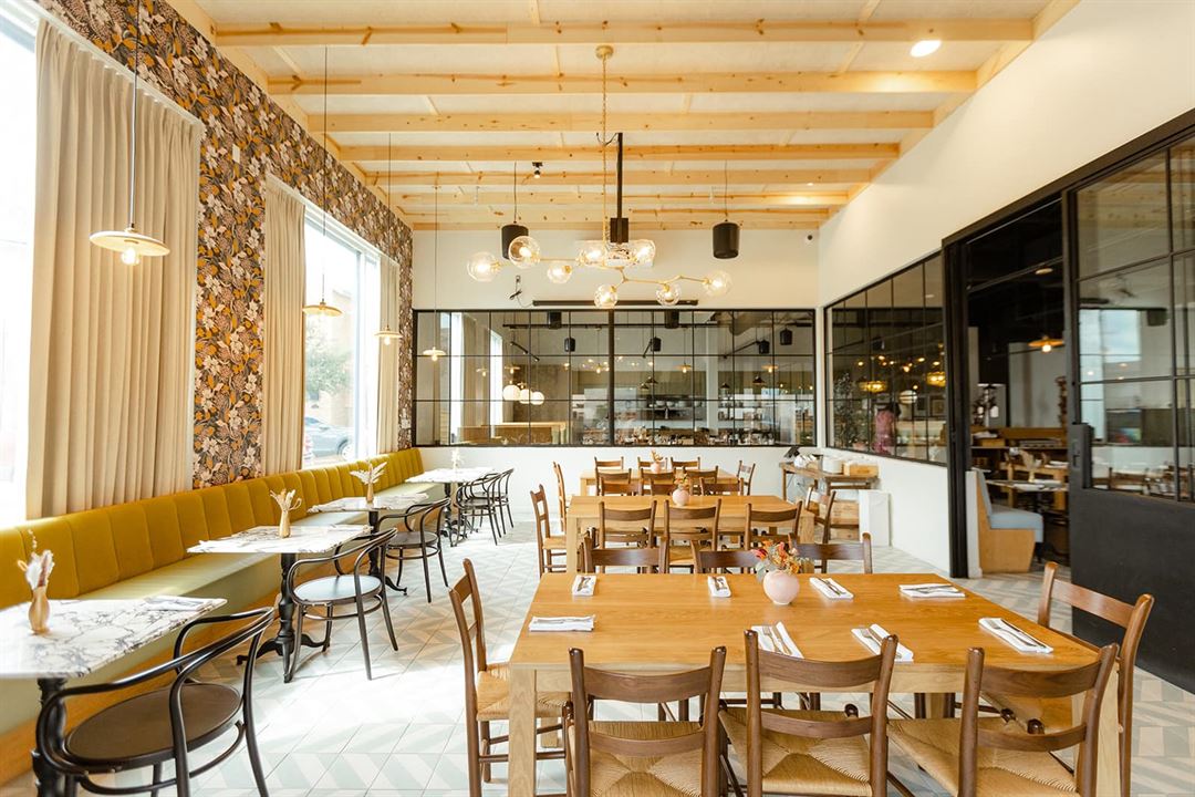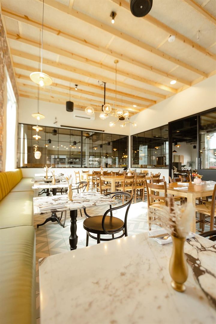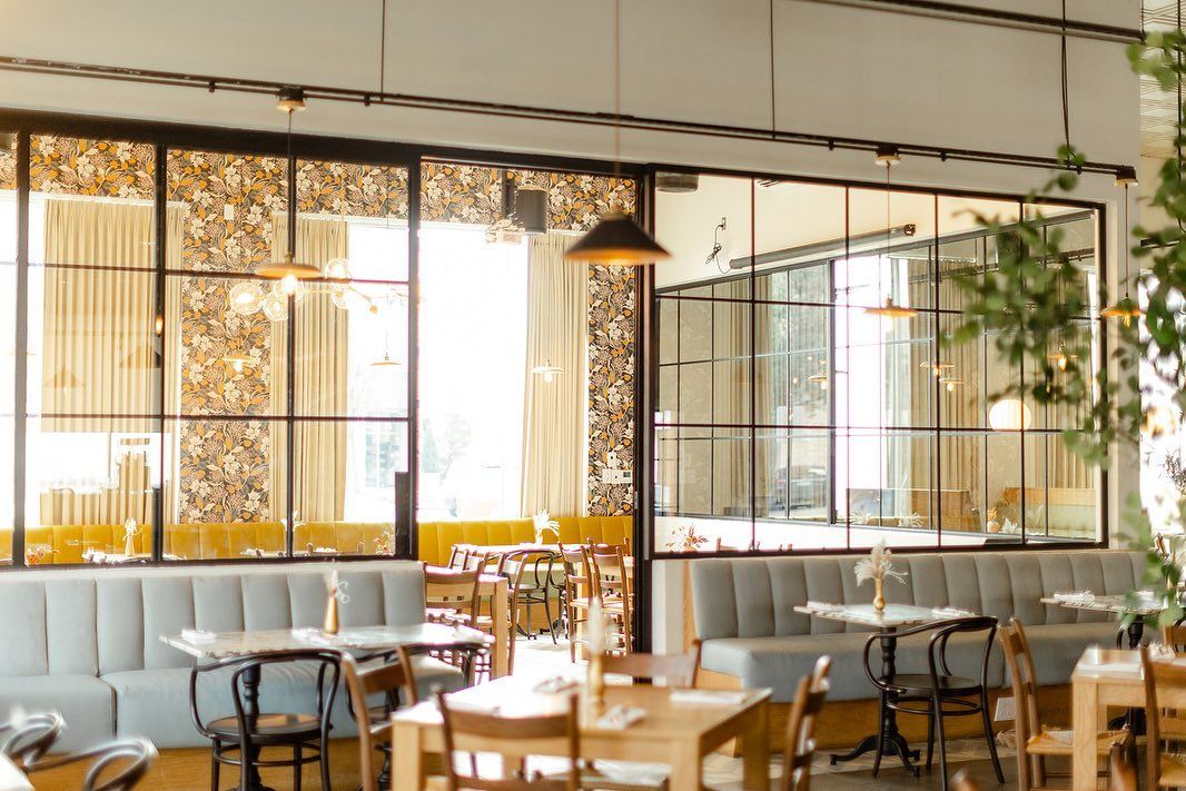 Elevated Restaurant with a private dining room that seats 45 comfortably, comes with both a 4k projector and its own sound system. Private with door closure.