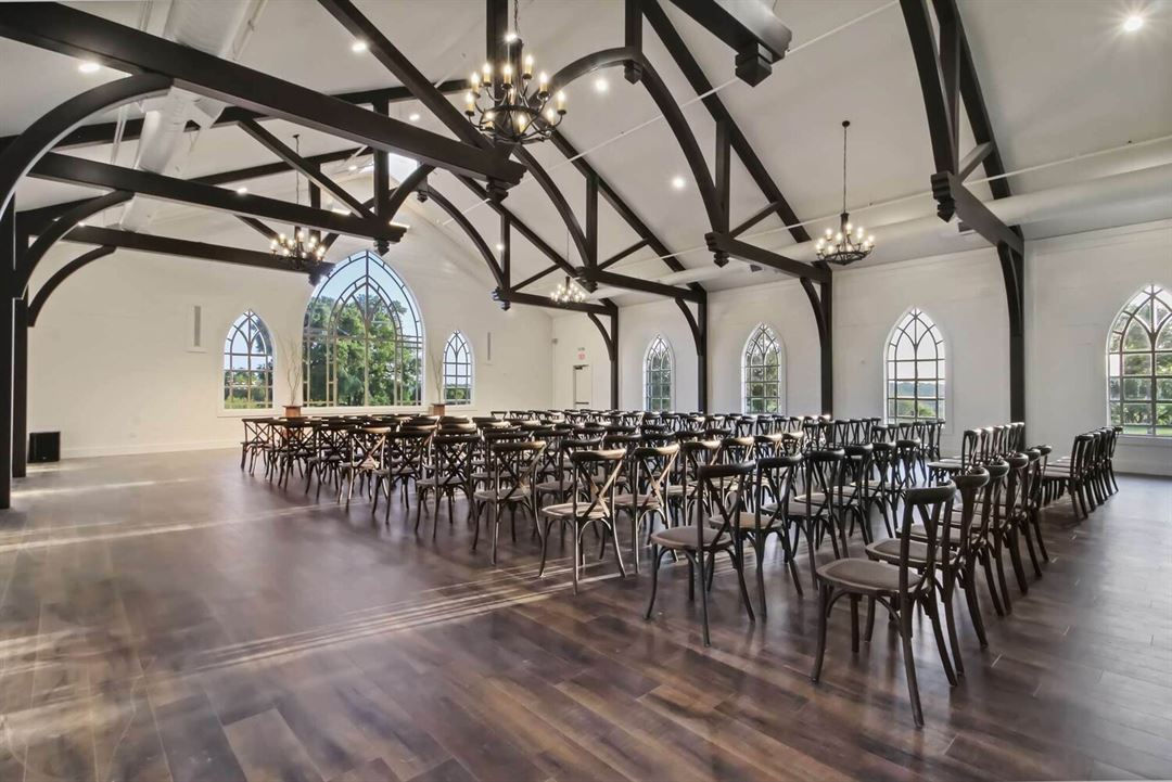 Evoking an old country church with an updated and modern vibe, our Chapel is a perfect indoor ceremony venue featuring shiplap walls with arched trusses and windows. The Gathering Room, with its 35-foot ceiling, is designed to offer you dramatic space and tremendous flexibility for the layout of your wedding reception or event. Both spaces accommodate up to 300 guests, and can be elegantly “dressed up” or maintain their casual farmhouse style.