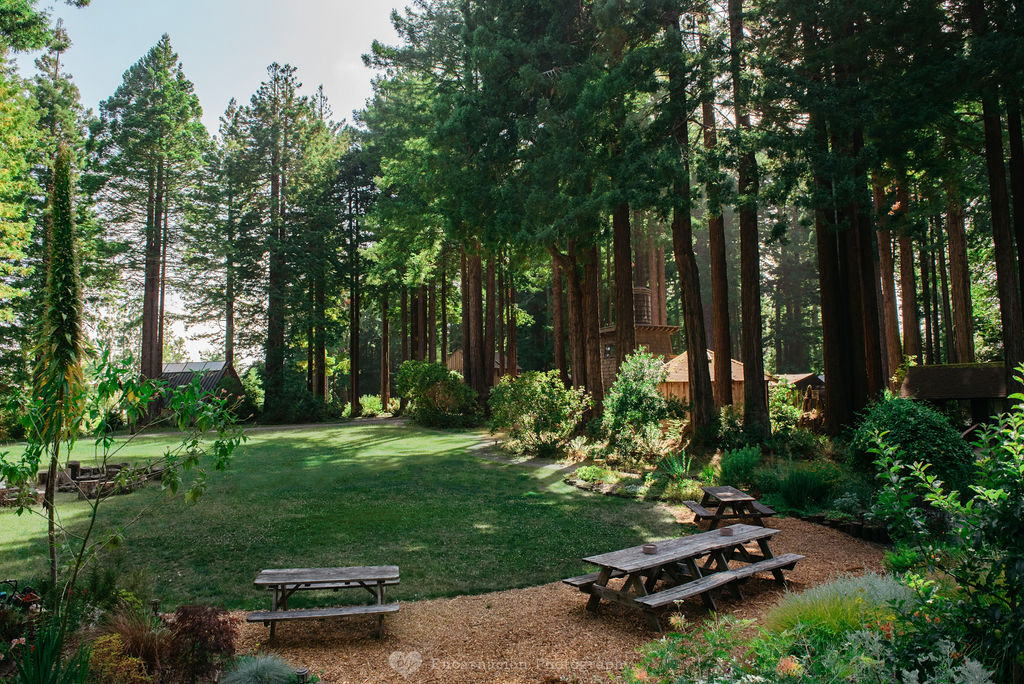 Magic Meadow serves as our central gathering space, surrounded by towering redwood and fir trees over 100 feet high with abundant natural sunlight filtering through the canopy. This spacious outdoor area accommodates large group activities, wedding ceremonies, team building exercises, and peaceful moments of reflection. Our private 1-mile hiking loop winds through magical fern gullies and crosses a charming stream bridge, offering guests nature immersion experiences without leaving the property.