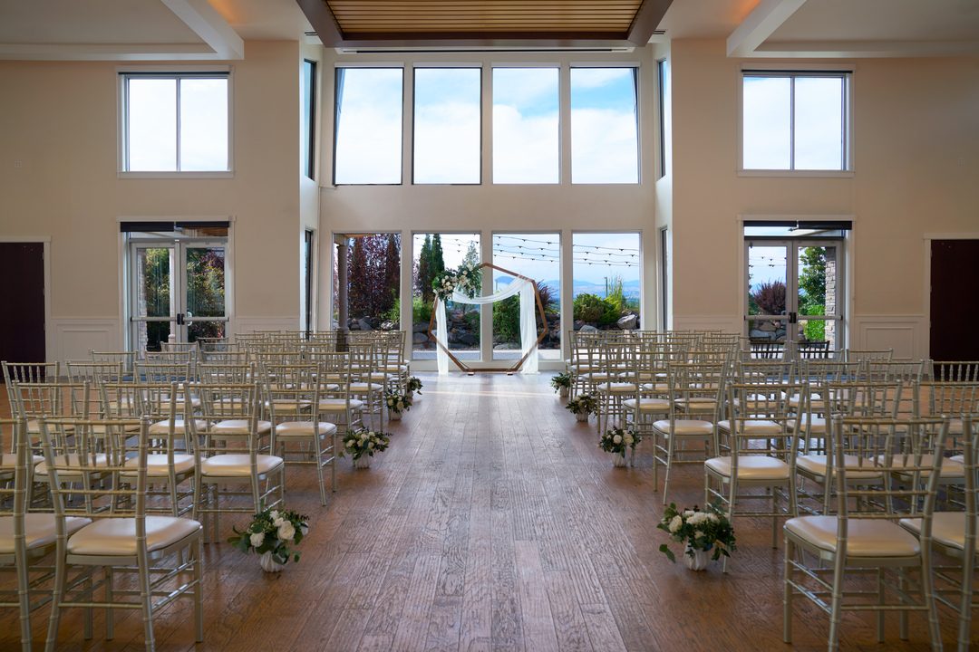 As you enter the grand foyer, a dazzling chandelier adorned with a halo of custom-colored lighting will take your breath away. Your guests will be guided through the banquet hall to the outdoor ceremony site, where striking stone accents, a rustic wooden archway, and twinkling bistro lights set the stage for your magical moment. And let's not forget the awe-inspiring backdrop—miles upon miles of the majestic Rocky Mountains.