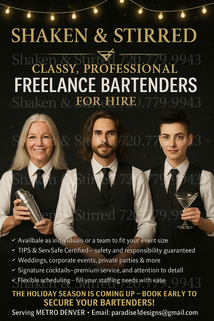 Available as individuals or a team to fit your event size. TIPS & ServSafe Certified – safety and responsibility guaranteed. Weddings, corporate events, private parties & more. Signature cocktails, premium service, and attention to detail.