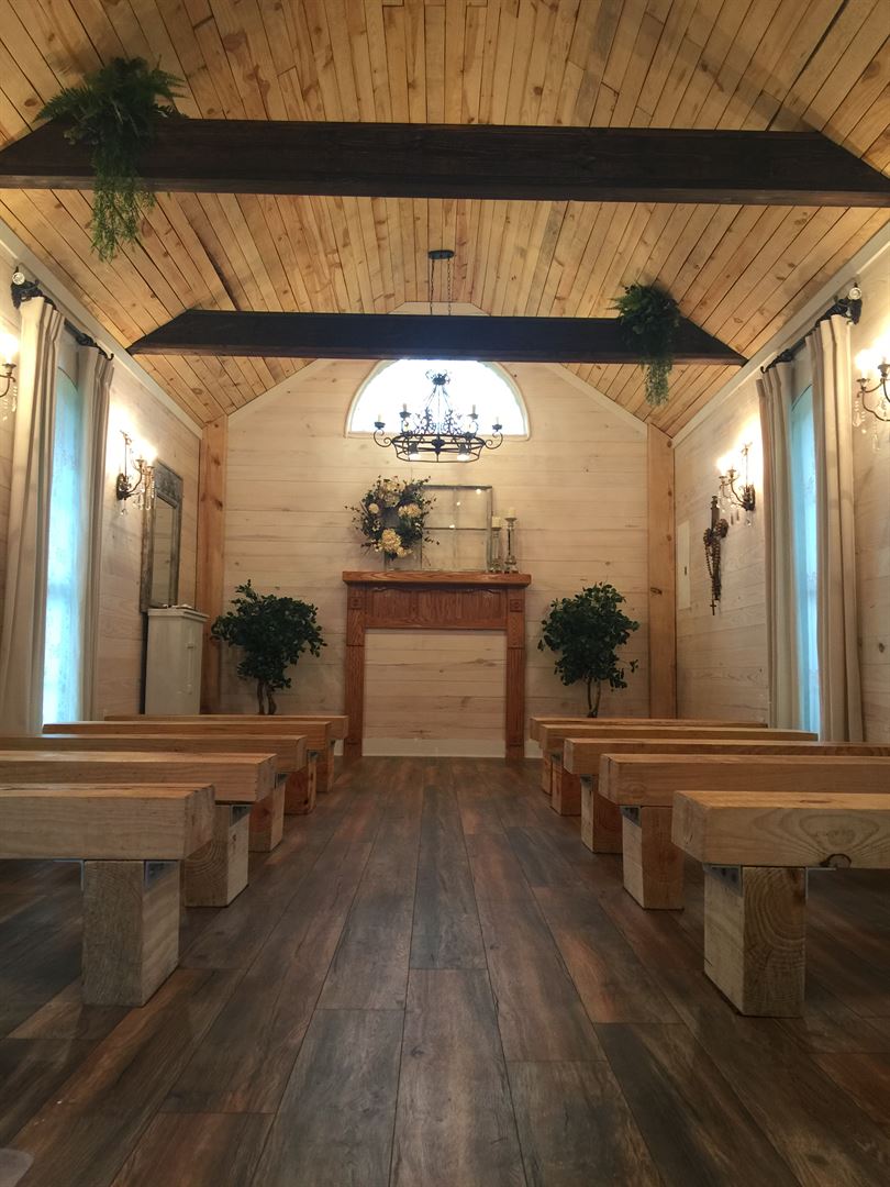 It is just right for a romantic setting for your special day. It has Vaulted ceilings with large exposed beams and milled lumber, the walls are center match boards that have been white washed (one board at a time!), stained glass arches, arched windows, wood plank flooring, beautiful chandelier and wall sconces, antique refinished pulpit for unity ceremony and signing the marriage license with a big old style mirror above, distressed mantle, special crosses and rosaries from different countries through out the building, custom made floor to ceiling drapes with lace panels inlays, floral arrangements were added for just a special touch, large oak mantel up front and before we closed in the walls we had friends and family send in best wishes, prayers and poems, rolled them up like little scrolls and stuffed them all around in the walls so we call these the WALLS OF LOVE, the benches were specially cut and made for our chapel and a stepping stone path will lead your way to your happily ever after. The chapel will seat 25-30 guest. Call or text to schedule your tour of your new little white Chapel or our Open Air Chapel area. www.tietheknotweddingchapel.com *NOT DISPLAYED* call or text
