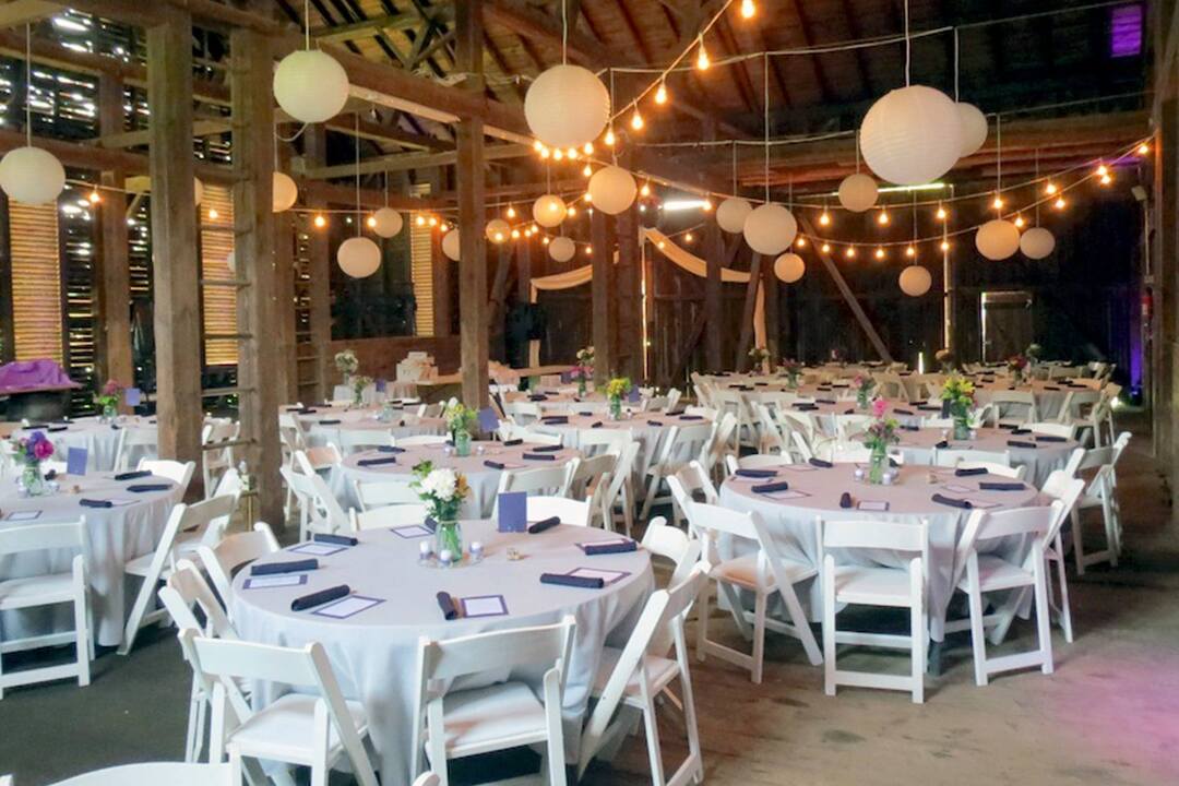 The barn, located at 652 Island Road, was constructed in 1900 by craftsmen of the day. Monstrous beams, both in diameter and length, provide the framework for the open space that can house more than 200 guests.