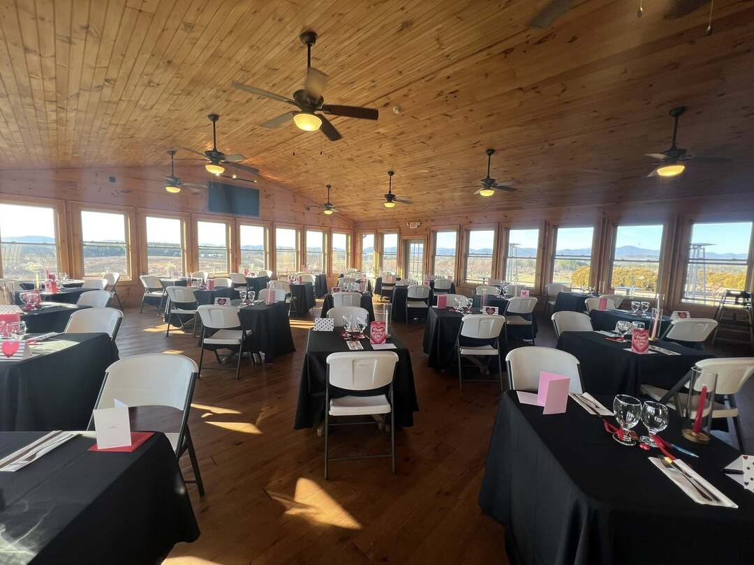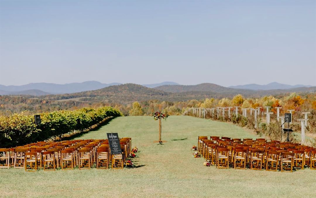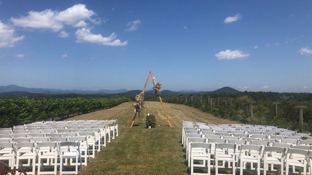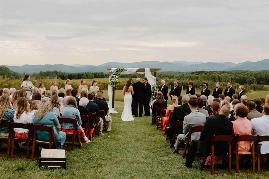 The event barn is the perfect place for your wedding or special occasion. The large stacked stone fireplace welcomes you and adds to the rustic charm of the barn. The back of the barn opens with large sliding doors onto a covered patio that frames the 270 degree view of the Blue Ridge Mountains. The barn also features a catering kitchen, restrooms, and lawn space for tents.