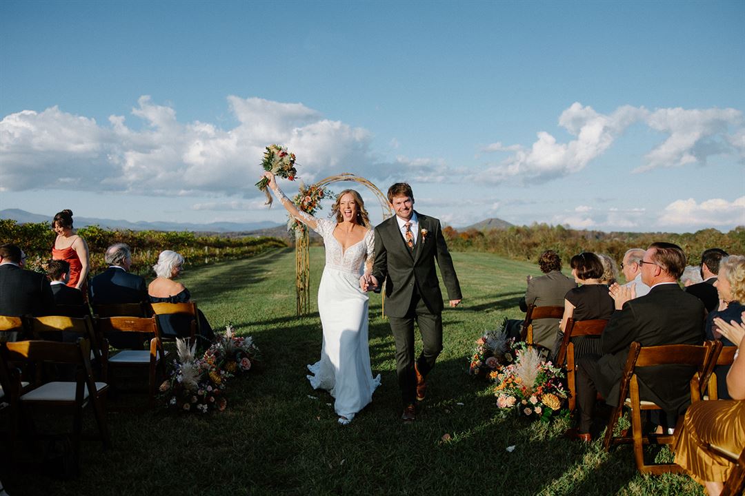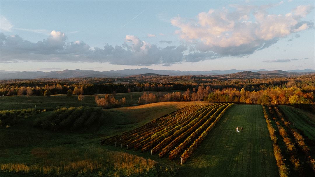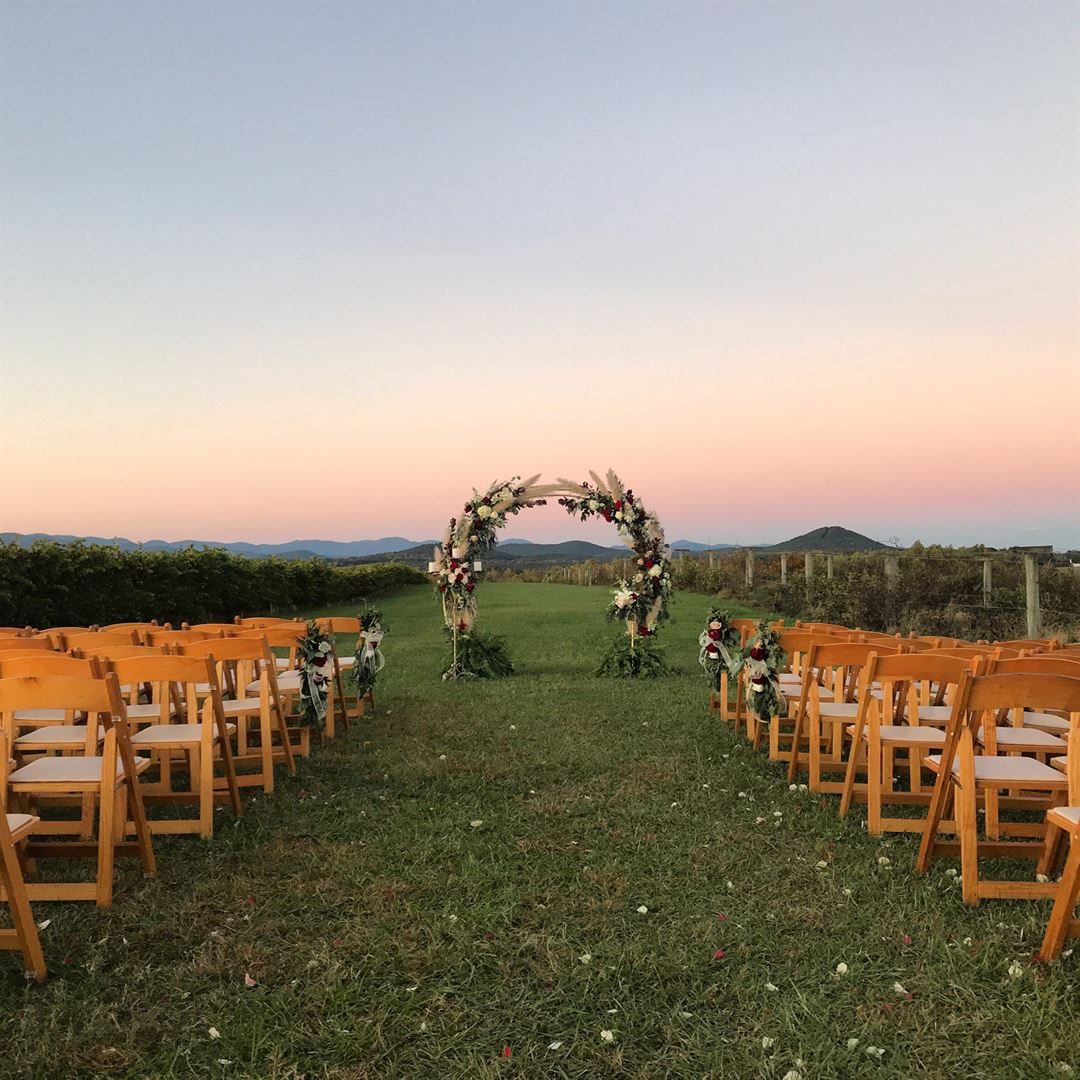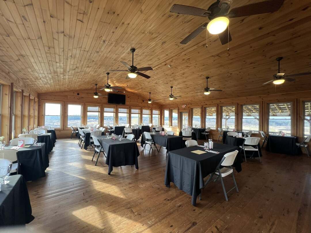 The event barn is the perfect place for your wedding or special occasion. The large stacked stone fireplace welcomes you and adds to the rustic charm of the barn. The back of the barn opens with large sliding doors onto a covered patio that frames the 270 degree view of the Blue Ridge Mountains. The barn also features a catering kitchen, restrooms, and lawn space for tents.