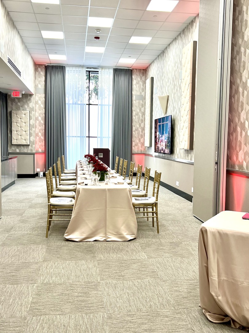 Kawada Hotel has approximately 690 square feet of meeting room space. From a small meeting, birthday, party, or any other event we are ready to host you. There are two conference rooms A (420 square feet) and B (270 square feet) that can be combined for a total of 690 square feet and a boardroom (230 square feet) located on the mezzanine that can meet your various needs. Conference A and B has a Sony State of the Art 85" smart TV. Catering is available for breakfast, lunch, or dinner.