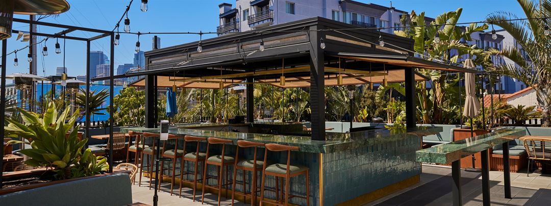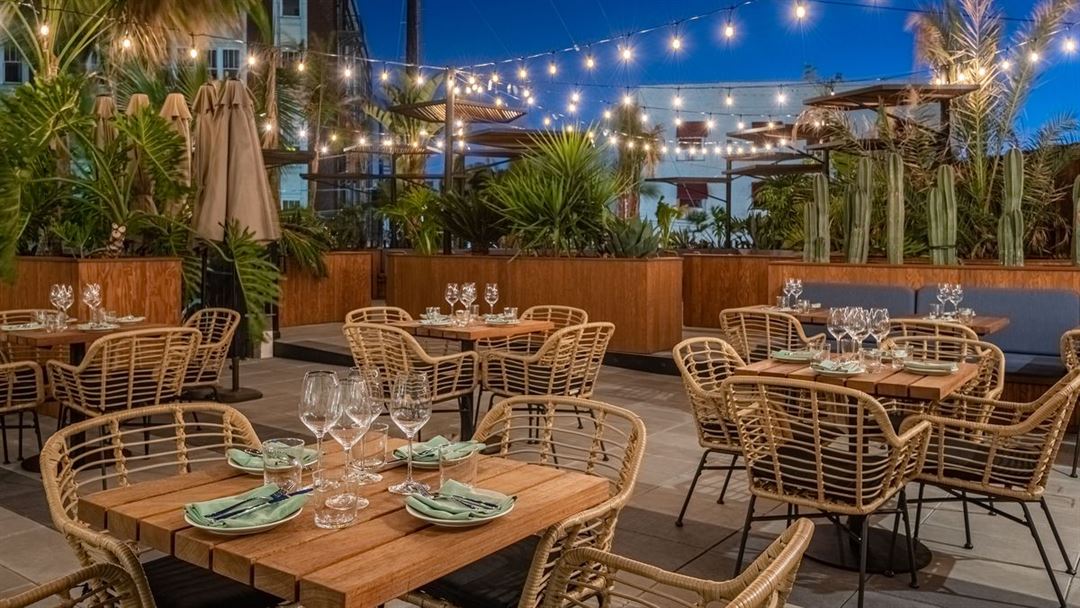 Beautiful rooftop restaurant with Downtown Los Angeles skyline as our backdrop