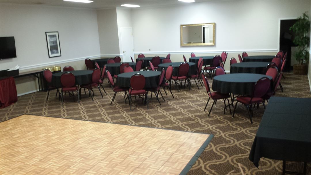 Our larger meeting space dimensions are 37' X 44'. Theater style holds 100 with chairs only, classroom style holds 48 people and Banquet style holds 90 people, it will also hold 65 people with dance floor.