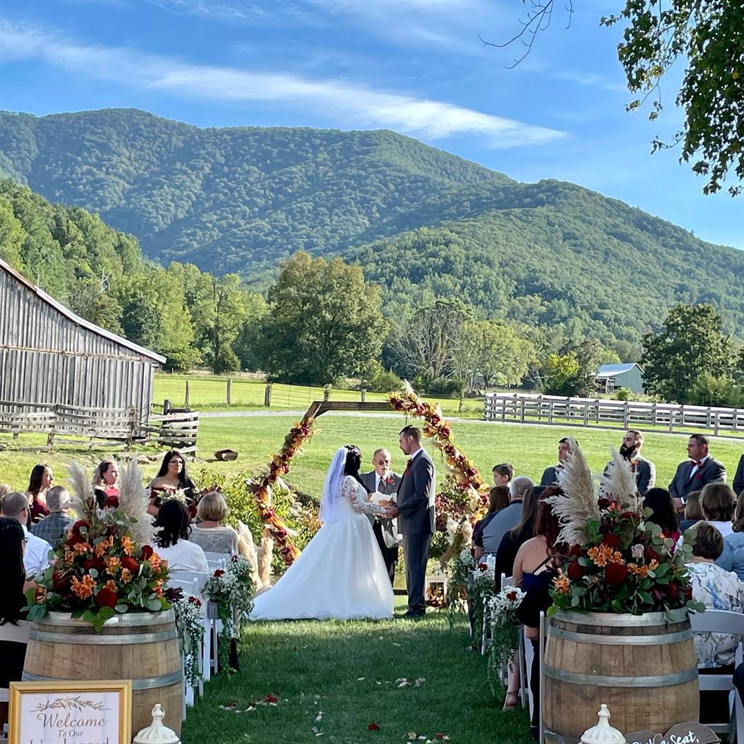 Enjoy breathtaking mountain views of the Blue Ridge Mountains, Massanutten Mountains and the Shenandoah Valley at Stoneyman Valley Ranch. Located just outside of Luray at the base of the Blue Ridge Mountain and Skyline Drive. Stoneyman Valley Ranch is a working cattle ranch with an abundance of open fields and 360 degree views. Our rustic and chandelier barn is air conditioned and heated and is ADA Accessible for your guests. It has a Bride's Room with separate bathroom, Loft for Gentlemen to relax, and other amenities.