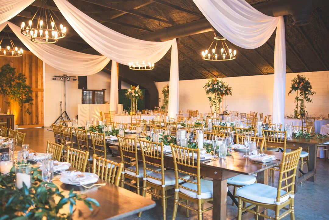 After exchanging vows, you and your partner can dine and dance with loved ones in the reception barn. Newly renovated, the interior combines vintage and modern details, resulting in a charming ambience for any occasion. Thanks to its Edison-bulb chandeliers, long farmhouse tables, and Chiavari chairs, it offers a welcoming atmosphere where you can create long-lasting memories with guests. Vintage doors at the back of the reception space open to a patio adorned with market lighting, inviting you to celebrate under the stars. For the comfort of you and your guests, the building is air-conditioned.