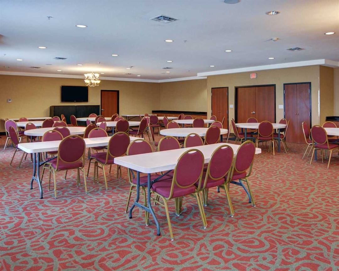 Our Mabank meeting room is 1652 square feet and pictured in the banquet setup. We also have 5 other layouts that the room can be positioned in. These include reception, theatre, classroom, conference and U-shape. The benefit of booking with our meeting area is that we can readily customize our room to your specific event needs. We also offer our guests various amenities like free WiFi, free newspaper Monday – Friday, guest use fax machine, speaker phone, guest use copy machine, and voicemail.