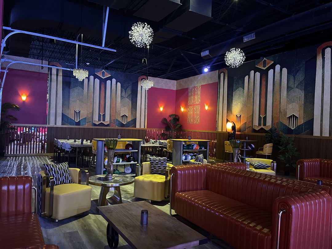 Our VIP Suite is custom themed in the style of a 1920’ s Speakeasy. Luxurious leather sofas and chairs, gold mirrored slatwall, Great Gatsby style murals, chandeliers and marble tables adorn this hideaway. 4 gorgeous bowling lanes are included for free with this suite.