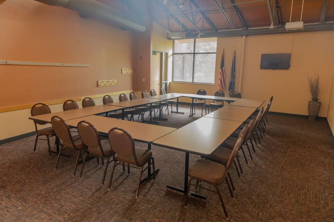 The Community Room has a seating capacity of 160 people when set with round tables and a capacity of 200 when set with chairs in rows. The room can be divided into smaller sections depending on the size of the event.