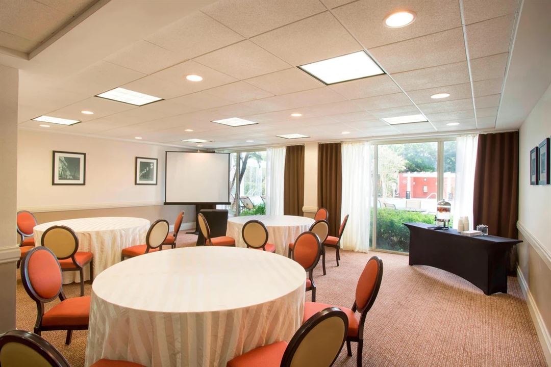 Each of our 17 venues boasts décor and ambient lighting that promote creativity and productivity. Our custom seating plans meet your needs, from meetings of 12 colleagues to 800-person conferences. Coordinate with our dedicated culinary team to create a catering menu that suits your tastes. High-speed Wi-Fi is available to livestream a presentation to associates outside of Florida. Ensure everyone in our Maitland event rooms can hear and see you with our AV equipment. After your meeting, network with colleagues at our on-site pub or in our beautiful atrium lounge.