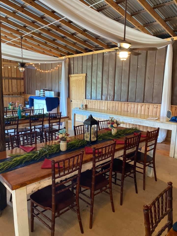 Anding Acres is the perfect location in Texas for your wedding or special event. We offer several sites for your outdoor Wedding , including Rustic area with bench seating or Open air chapel with draping and church pews. Our 5600 square foot Reception Open air Barn is large enough for 200 guests, with climate controlled bridal suite, groom quarters, rest rooms, and catering kitchen. An outdoor wedding is not complete without the outdoor dance floor. We have it! Plus a band stand for your DJ or live band. Dance the night away under the Texas stars, Complete with lighting all the way around and the Big Texas flag in the back ground.
