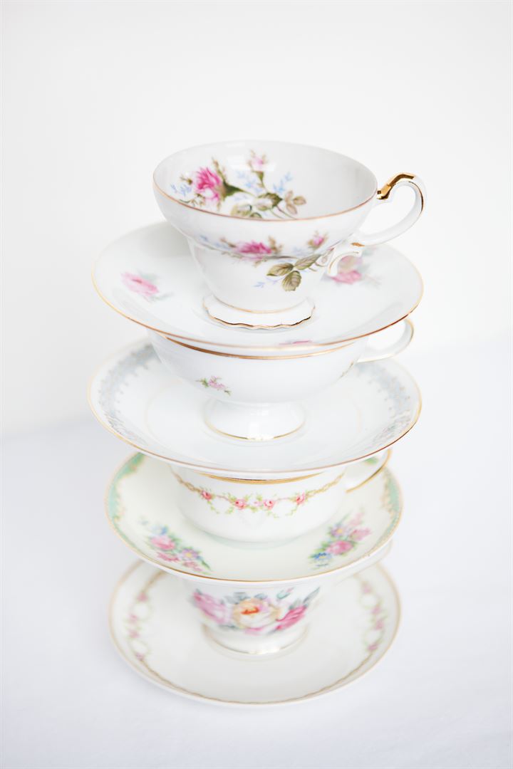 Our mismatched floral teacups and saucers pair well with a variety of platters, cake stands and trays.