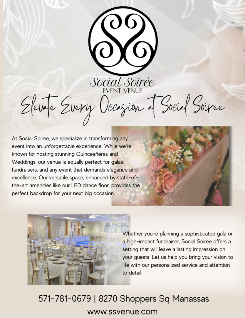 Social Soiree is an event venue that provides full service so that you can enjoy your event. At Social Soiree the gathering place where memories are made. We take care of the details of your event so that you can enjoy it. We have customizable packages to make your event unique. Located in Manassas, VA in the Mega Mart shopping center with ample parking space. Right off Route 28. From weddings to quinceañeras to birthdays, baby showers, and baptisms we make your event enjoyable.