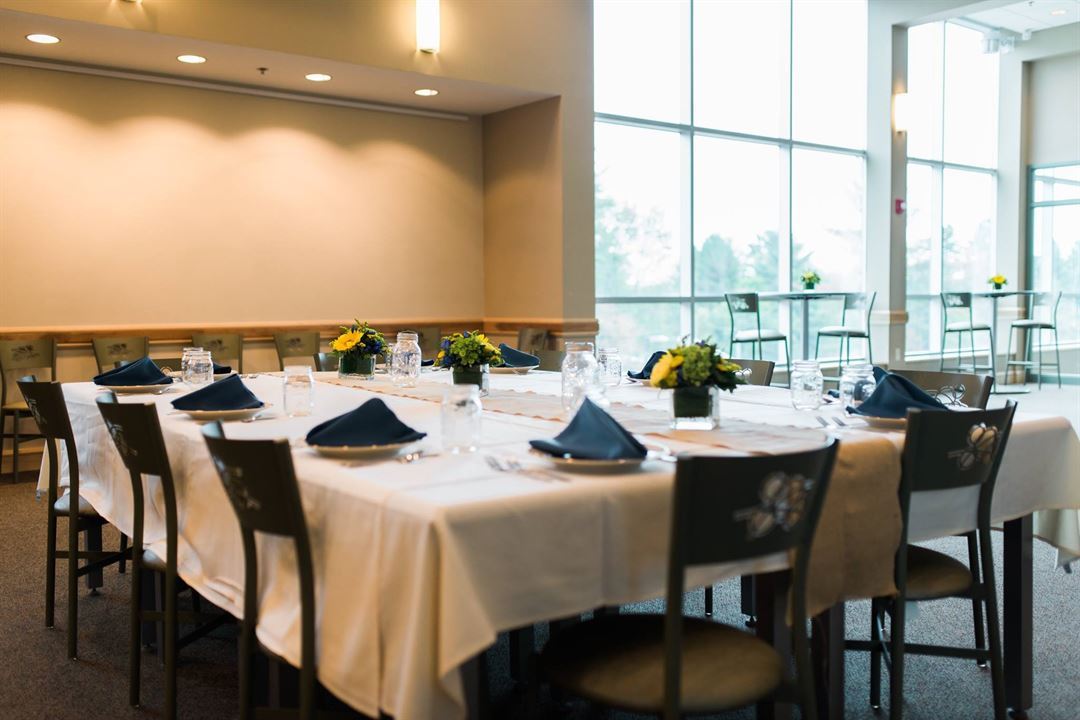 The Dining Center Banquet Hall is a great place to host an event with state-of-the-art technology for presentations, wireless Internet, banquet-style seating for 350, theater-style seating for 500, meeting space for up to 500, dividable space to allow for two venues, computer network access with up to 200 physical ports of connectivity, two LCD projectors with two 15-foot diagonal screens, and catering services to accommodate all of your food and beverage needs.