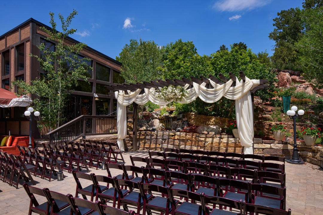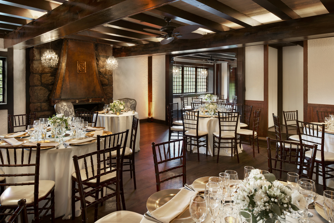 Tucked into a charming Tudor-style setting, this distinctive wedding venue combines storybook architecture with natural beauty. The property features a signature tan and brown cottage with steep A-frame roofing and decorative timber framing, creating an enchanting atmosphere. The outdoor ceremony space showcases rows of mahogany chairs under a pergola, while multiple photo opportunities await throughout the grounds - from a rustic stone archway to an artistic stained-glass garden entrance. The venue transforms beautifully from day to evening, with ambient string lighting illuminating the exterior and a welcoming entrance marked by the restaurant's warm, glowing signage. Ideal for couples seeking an intimate, romantic setting with indoor and outdoor ceremony options.