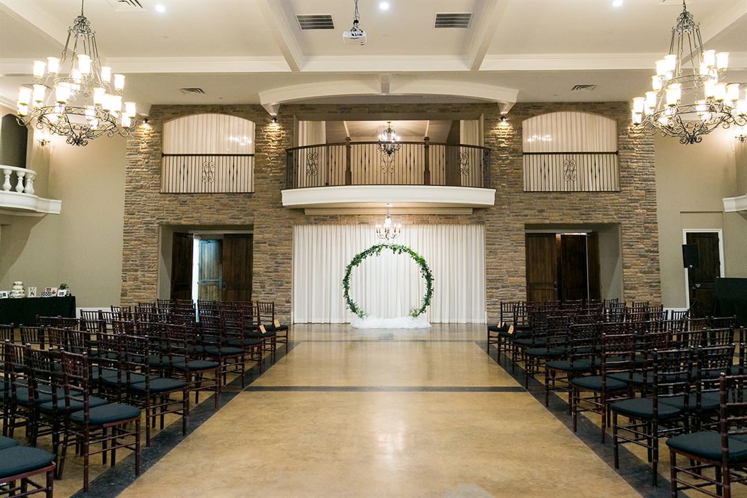 Our grand ballroom is the ideal space for your dream reception. Aristide | Mansfield’s 16 arches in the second story of the ballroom can provide colored lighting that will complement and set the mood for your event. The ballroom has four large 6-foot-high chandeliers that are quintessential Tuscan. The wooden beams in the ballroom complement the floor detail and tie the room together. Throughout the Venue, we have several gorgeous photo opportunities from our classic stone wall, cocktail area, outdoor fireplace and beautiful wooden doors.