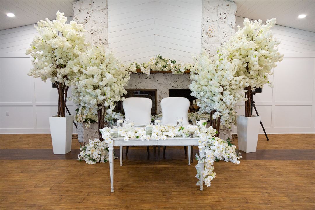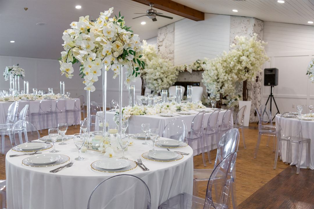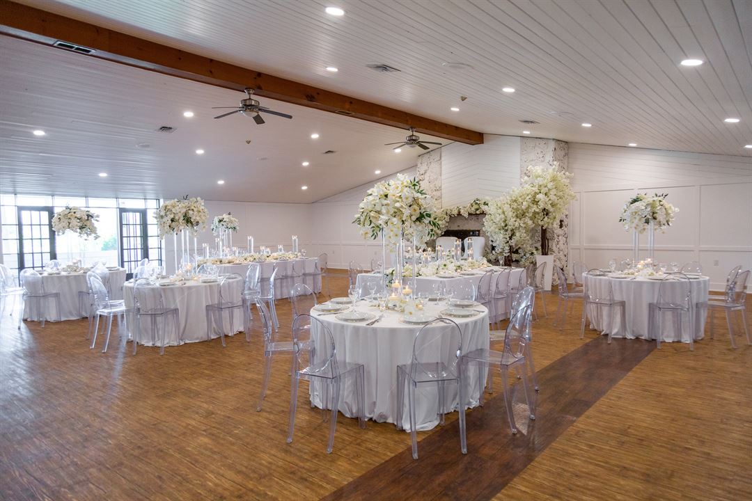 The Main Hall features an elegant modern farmhouse style, with white wainscoting and beautiful industrial chandeliers. The charming vaulted ceiling is centred by an exposed beam that leads to a natural stone fireplace - the perfect centrepiece for the head table.