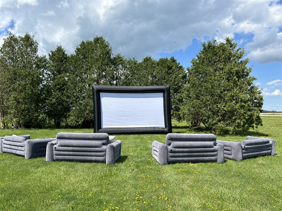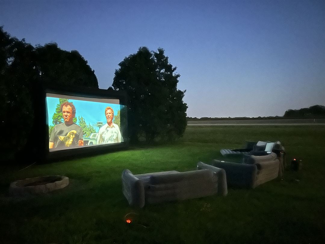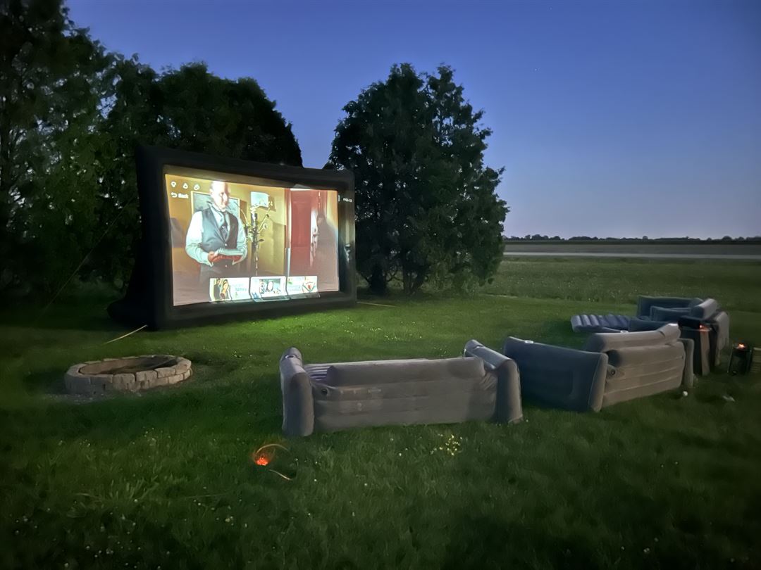Outdoor movie night rental 20 foot projection screen, for outdoor couches, for outdoor blankets and pillows, projector included, as well as Amazon fire stick perfect for outdoor movie night, karaoke, music, videos, playing at an event