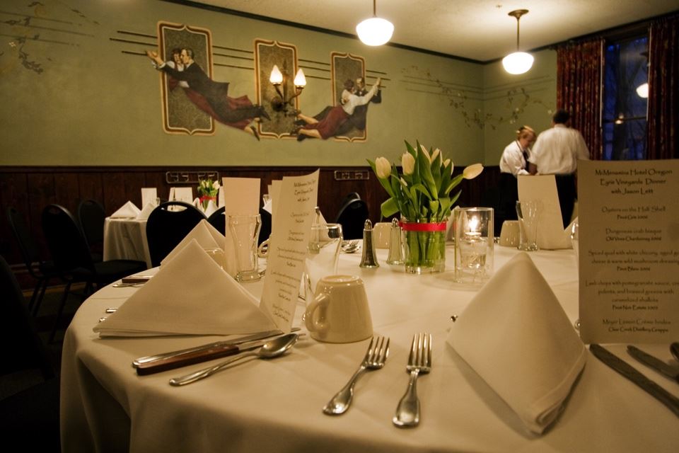 Open daily for breakfast, lunch and dinner, the airy and artful first-floor pub of McMenamins Hotel Oregon is an attractive rendezvous for a delicious meal. Built-in booths, individual tables, and an impressive 40-foot-long bar afford three comfortable seating options, and views of Third and Evans streets are prominent through the pub's prolific windows. Lighting most unusual completes the setting for memorable dining or a casual meeting over the glint of a fresh pint. Gatherings over a meal are certainly not unusual to this storied hotel. And although the restaurant used to be where the Paragon Room is today, it was still a place where locals and travelers gathered for a well cooked meal made with ingredients raised on the proprietor's farm. By the 1950s, folks knew that the popular restaurant served up the best steak and seafood around. Like the Hotel's earlier eateries, McMenamins offers a variety of mouthwatering entrees ranging from hearty, Northwest-inspired classics to delicious daily specials.