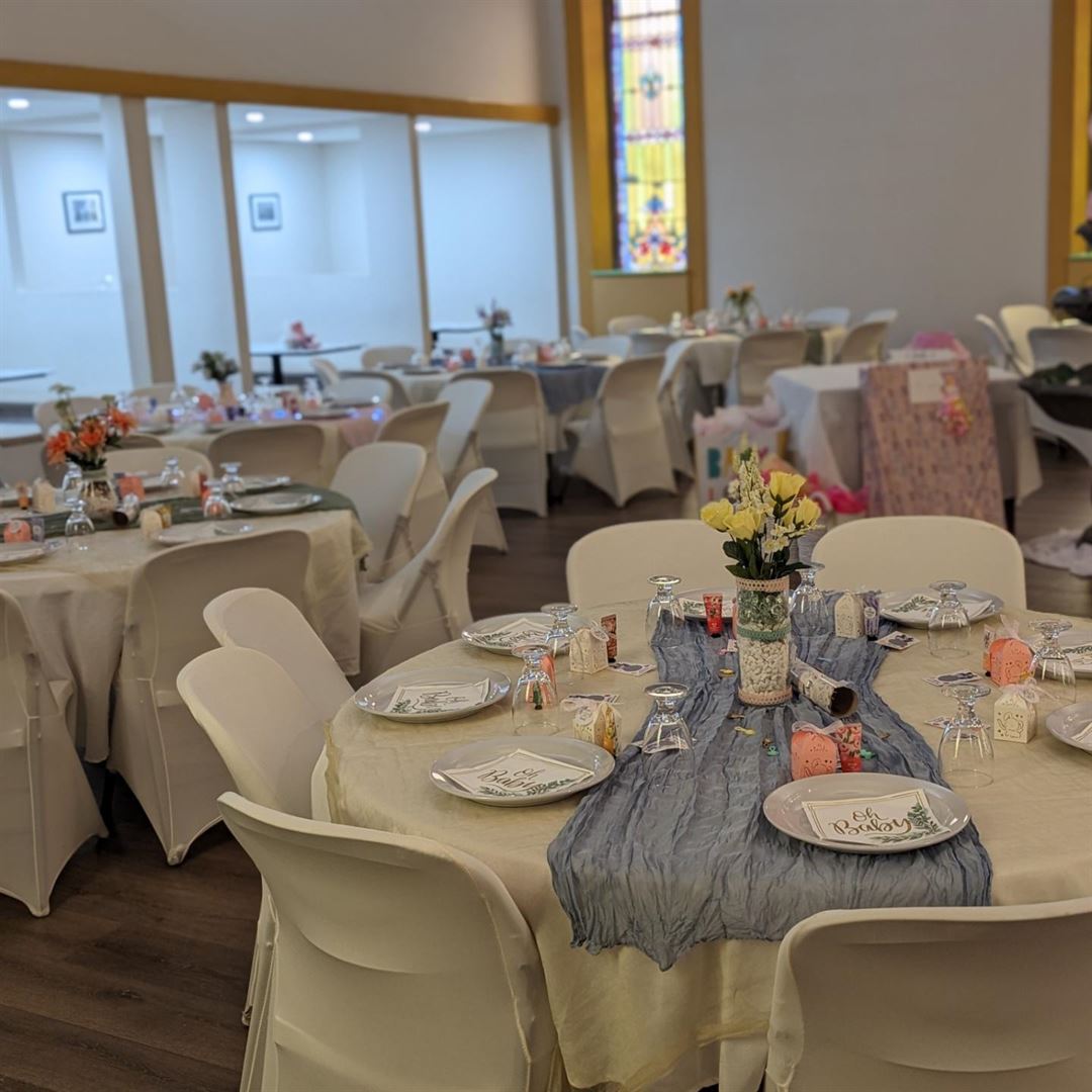 Dalicia Ristorante and Bakery located at 105 S Market St in downtown Mechanicsburg is a beautiful historic church. Newly renovated upstairs, with a Maximum Capacity of 150 guests, this beautiful 2,300 square foot venue is the perfect place for hosting receptions, parties, and other gatherings. With original stained glass windows towering about 12 feet high around the venue, this 132 year old church has beautifully preserved architecture that will add an elegant feel to any event. Newly renovated just this year, this venue offers key amenities such as large counter space, LED lighting, generous seating, and table settings. Dalicia offers European cuisine served buffet style catered for any event.