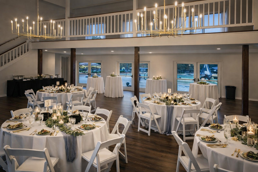 Our newly renovated clubhouse offers a clean, open, and versatile space perfect for weddings, celebrations, meetings, and special events of all kinds. The layout features a bright main room, an included loft, and a convenient side room, allowing flexibility to bring your vision to life. Convenient kitchen area provided when not in use by the Outdoor Pools. When the outdoor pool is closed, the patio is also available, adding even more space for guests to enjoy. The clubhouse is fully handicapped accessible, with a front entrance, designated parking, and accessible restrooms. Tables and chairs are included with your rental, and our elegant chandeliers create an upscale, sophisticated atmosphere. We would love to help you host a memorable event—contact us today to get started!