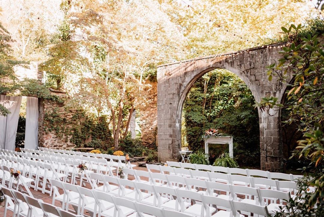 Nestled in the serene woods of the Borough of Rose Valley, The Old Mill is ideally situated on the grounds of Ridley Creek adjoining a 12-acre wildlife and bird sanctuary. Lush green gardens and gentle streams will provide the ambiance for your outdoor wedding ceremony. You and your guests can meander through the rustic courtyard ruins and gorgeous timber pavilion during the cocktail hour then make your way into the ballroom for dinner and dancing the night away.