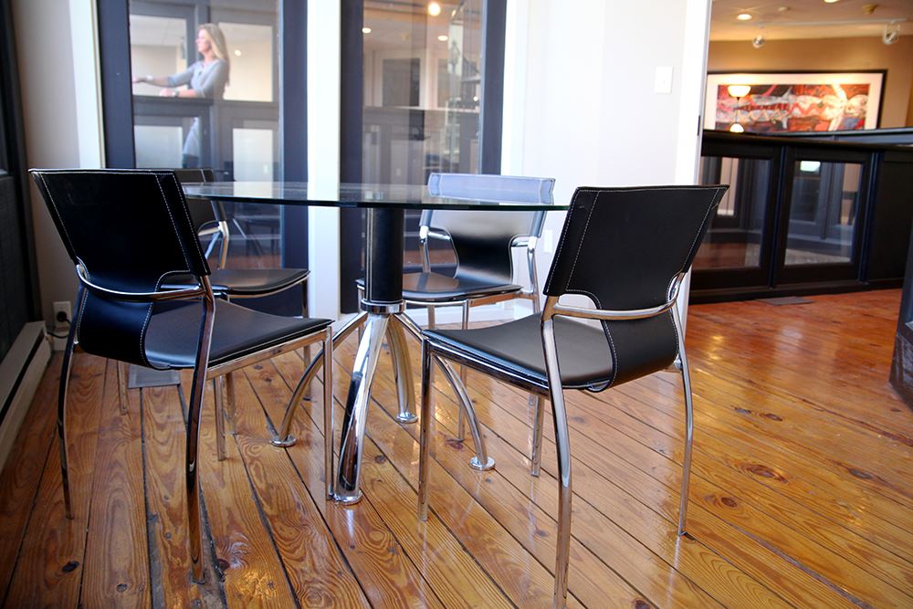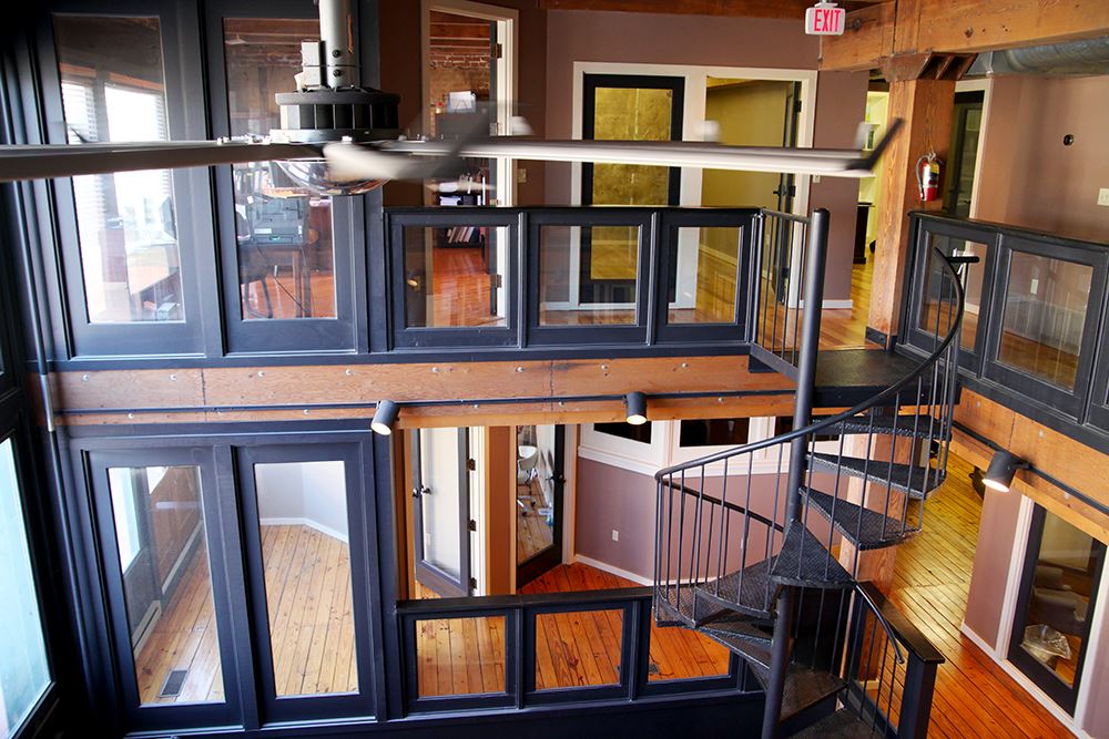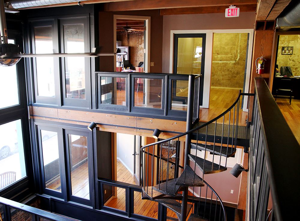 18 beautiful office suites, many with river views, modern co-working spaces, professional corporate suites, impressive conference rooms, convenient workout facility, full kitchen, premium event venue, and unique design throughout.