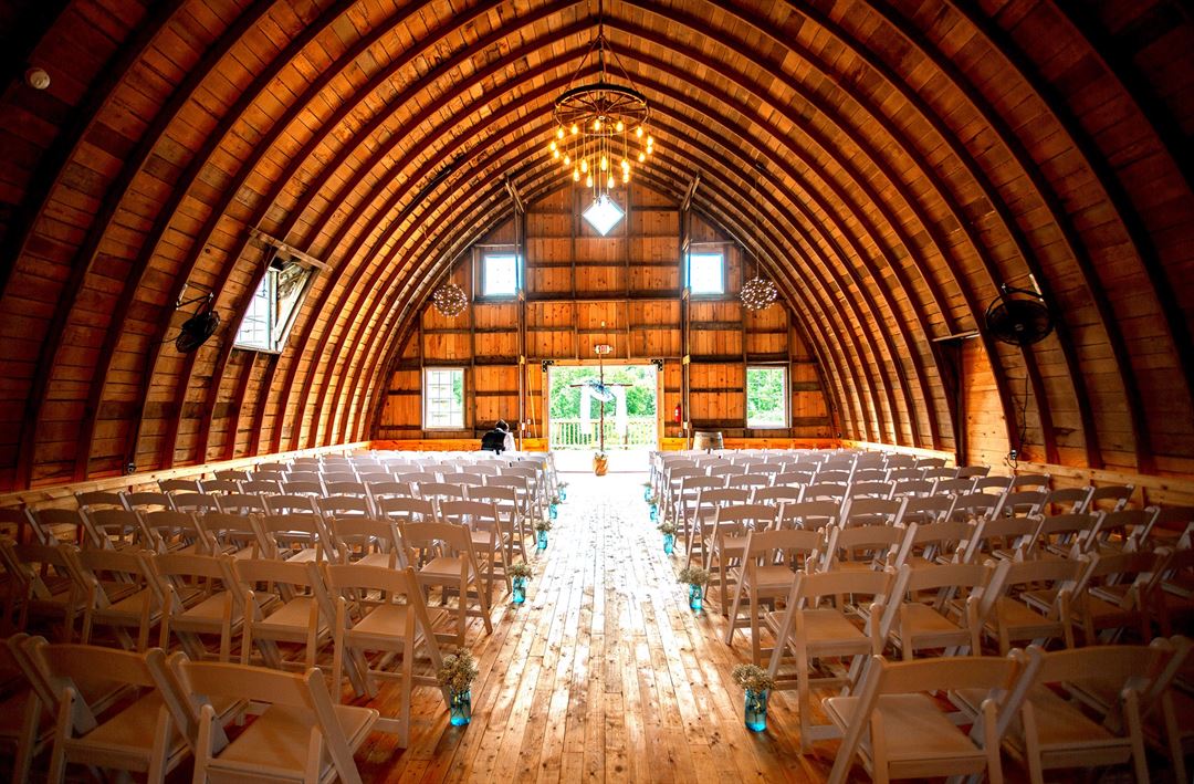 • White ceremony chairs, wooden dining chairs, handcrafted barnwood tables, and exquisite chandeliers throughout