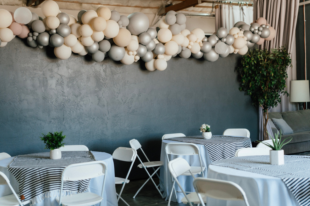 Our space includes tables, chairs, and linens in your choice of grey, white, or black. We also have a selection of centerpiece options available.