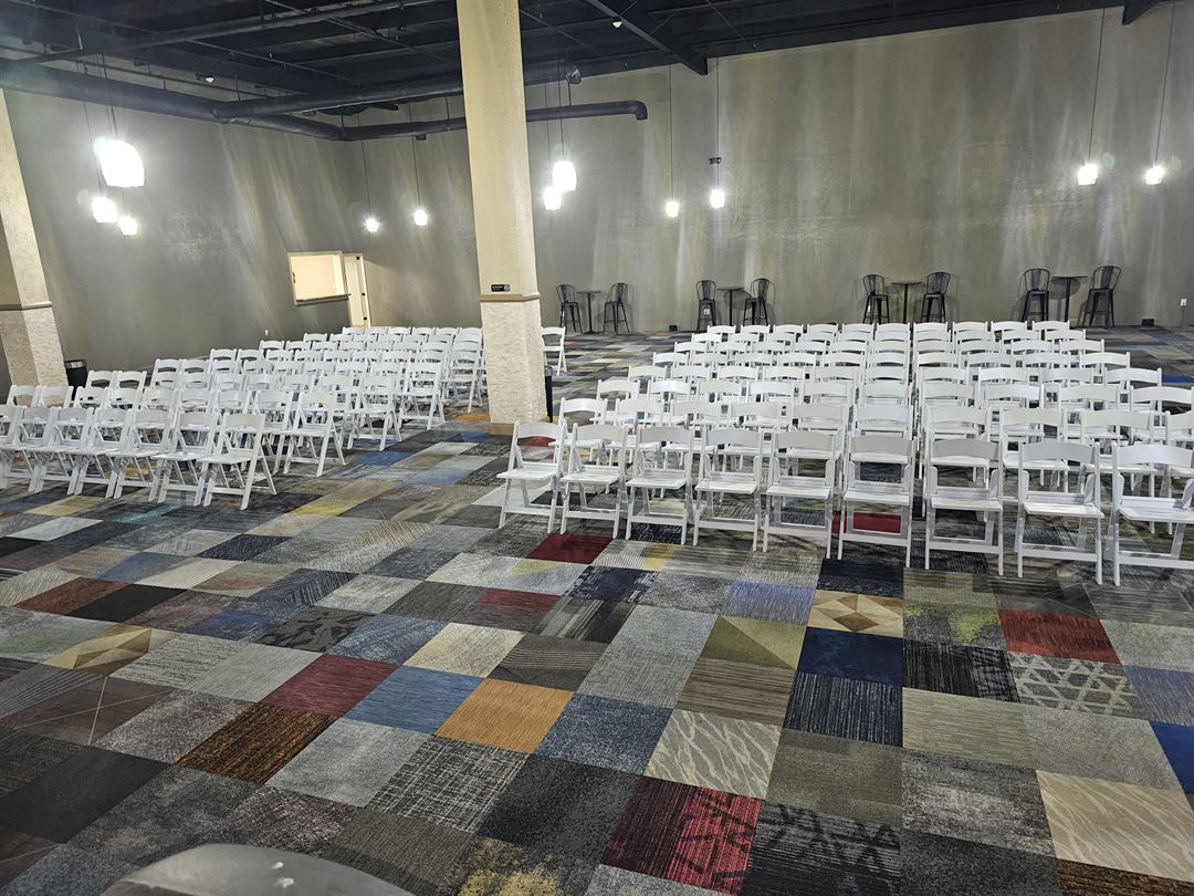 The Copeland Center is an over 16000 sq.ft. business center that also serves as a rental venue for all types of ceremonies and events. Our doors open to a modern foyer with a reception desk and seating. You further proceed to the large Gallery that features an indoor waterfall, additional seating, and grants access to additional event rooms and offices. The oversized, marble floor bathrooms feature a makeup table for the ladies and shoeshine/buffer for the men. The large kitchen is perfect for any catered event and provides a bar with open access to the Grand Ballroom. On the other side of the French doors, is the remarkable 5000 sq.ft. Grand Ballroom which features dimmable globe lighting, color selection up-lighting, round tables and chairs, and a stage. An upscale outdoor courtyard, The Ruins, is attached to the Copeland Center. It is furnished with patio furniture, umbrellas, an immense bar with sink, photo backdrop, and bathrooms. The Renaissance is our newest venue for 100 guest or less.