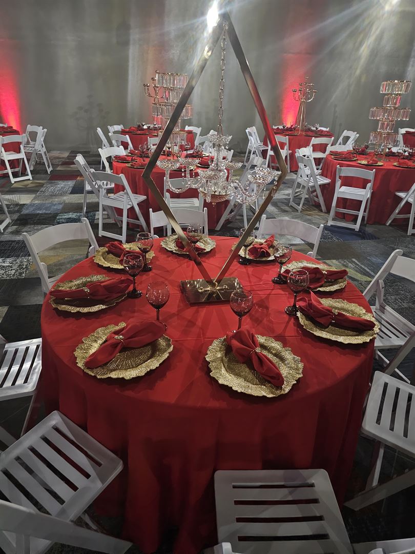 It is located in the heart of downtown Meridian and is all inclusive. Round tables, satin tablecloths, high back Chiavari chairs, center pieces, charger plates, up-lighting and a Bluetooth sound system are included in the price.