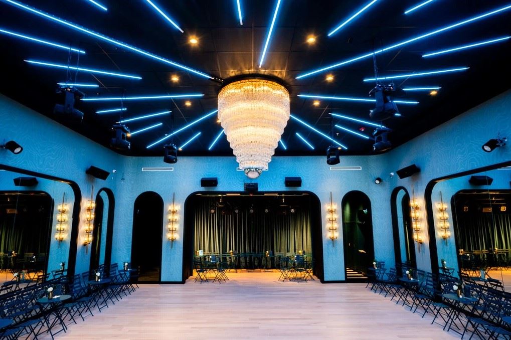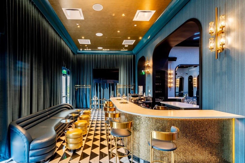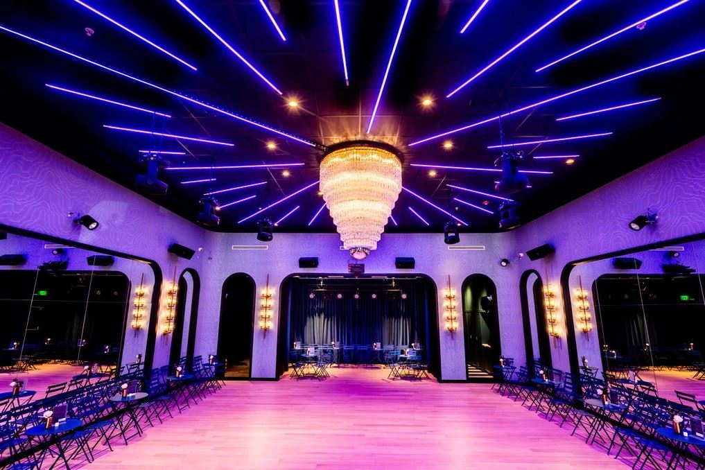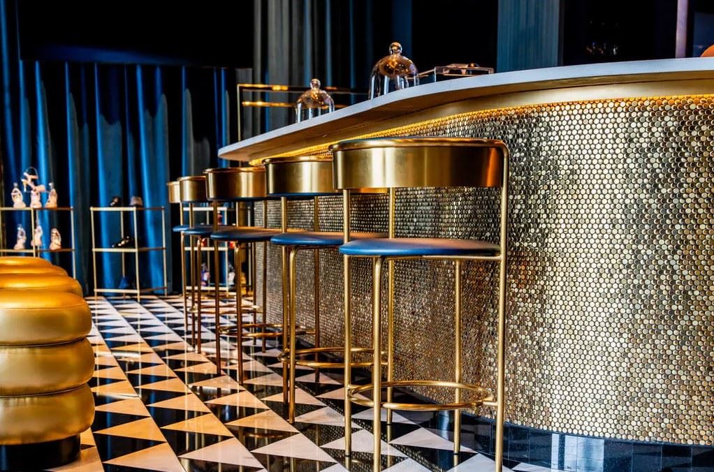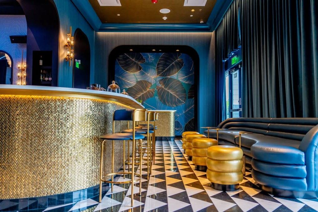 A dramatic, art-deco inspired bar takes center stage within the lobby-lounge with a custom light-sculpture hanging overhead made of neon.