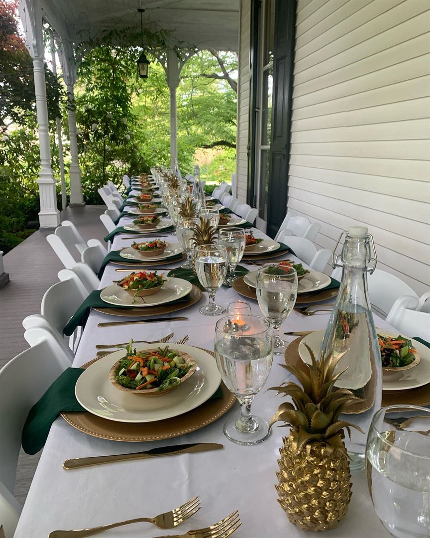 On the corner of Lancaster City & the countryside of Millersville, Pineapple Manor is an 1885 Victorian renovated with timeless style & elegance. English gardens bursting with thousands of tulips, peonies, roses, & more from spring through fall make this a perfect place for a garden party. A covered wrap-around porch offers intimate cocktail hours & dinner parties. Wedding parties dance the night away on a checkerboard patio under sting lights. Sound system included. On-site catering. All tables, chairs, luxury linens, serving ware included.