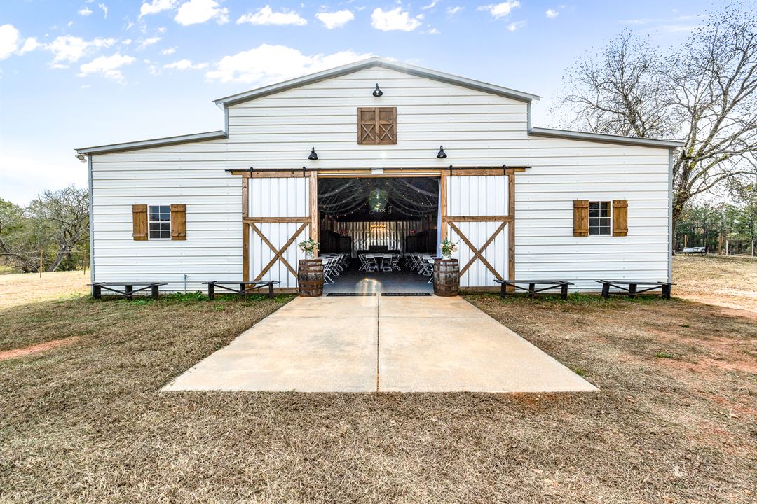 There are 4 outdoor ceremony sites with a mobile set of ceremony doors. The barn has a kitchen, 3 buffet tables, decor room, bridal suite, groom suite, and bathroom. There are 2 additional bathrooms outside. There is a courtyard and send-off lane.