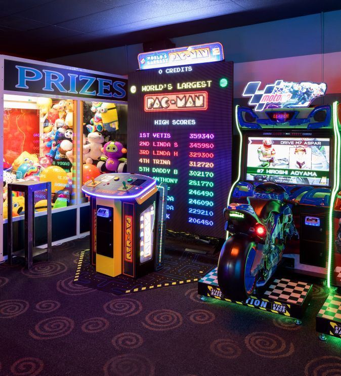 Experience the best in blacklight bowling on 40 lanes featuring plush lounge seating, huge video walls, and convenient laneside service. Our Milpitas location also boasts some seriously cool arcade games—from World’s Largest Pac-Man and Jurassic Park Arcade to MotoGP motorcycle racing, Sink It!, and other cutting-edge titles. Challenge your friends to air hockey, practice your jump shot on multi-player NBA Hoops basketball, or just goof off with your besties in our interactive photo booth. At Bowlero Milpitas, bowling is just the beginning.