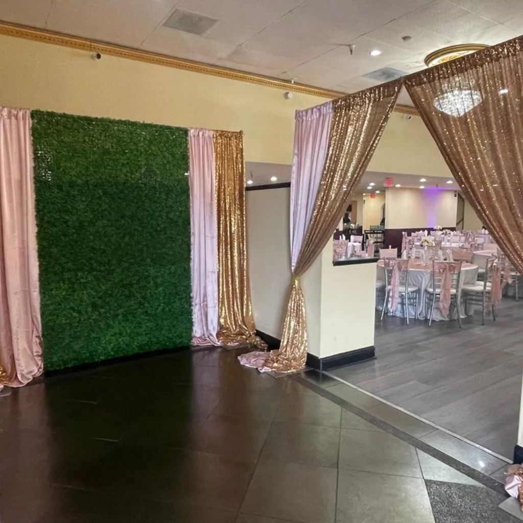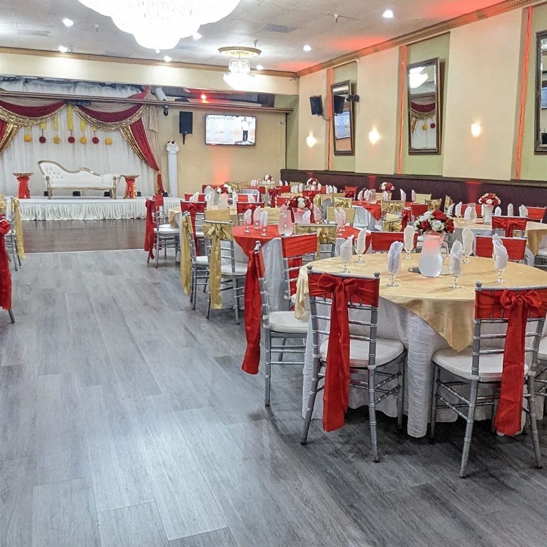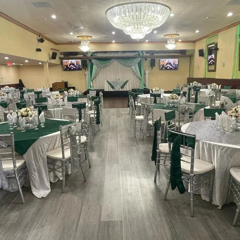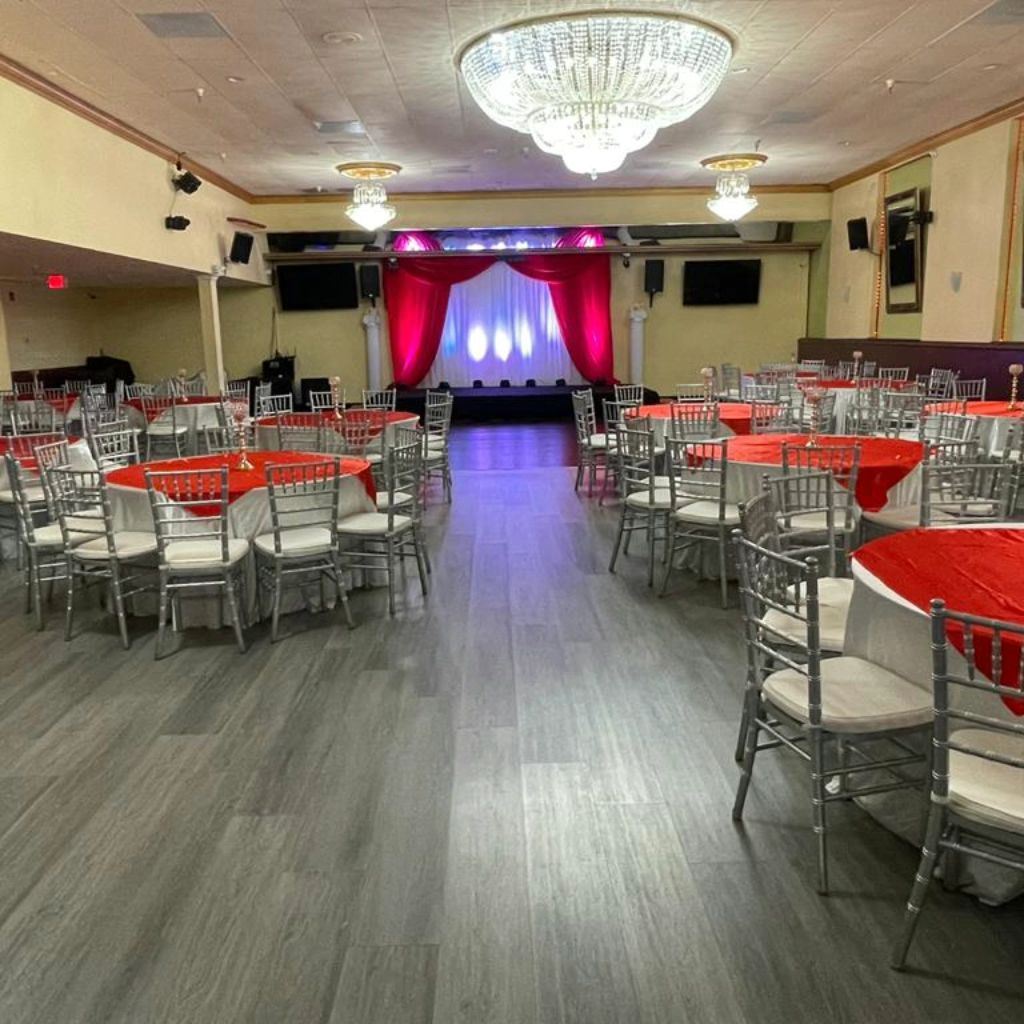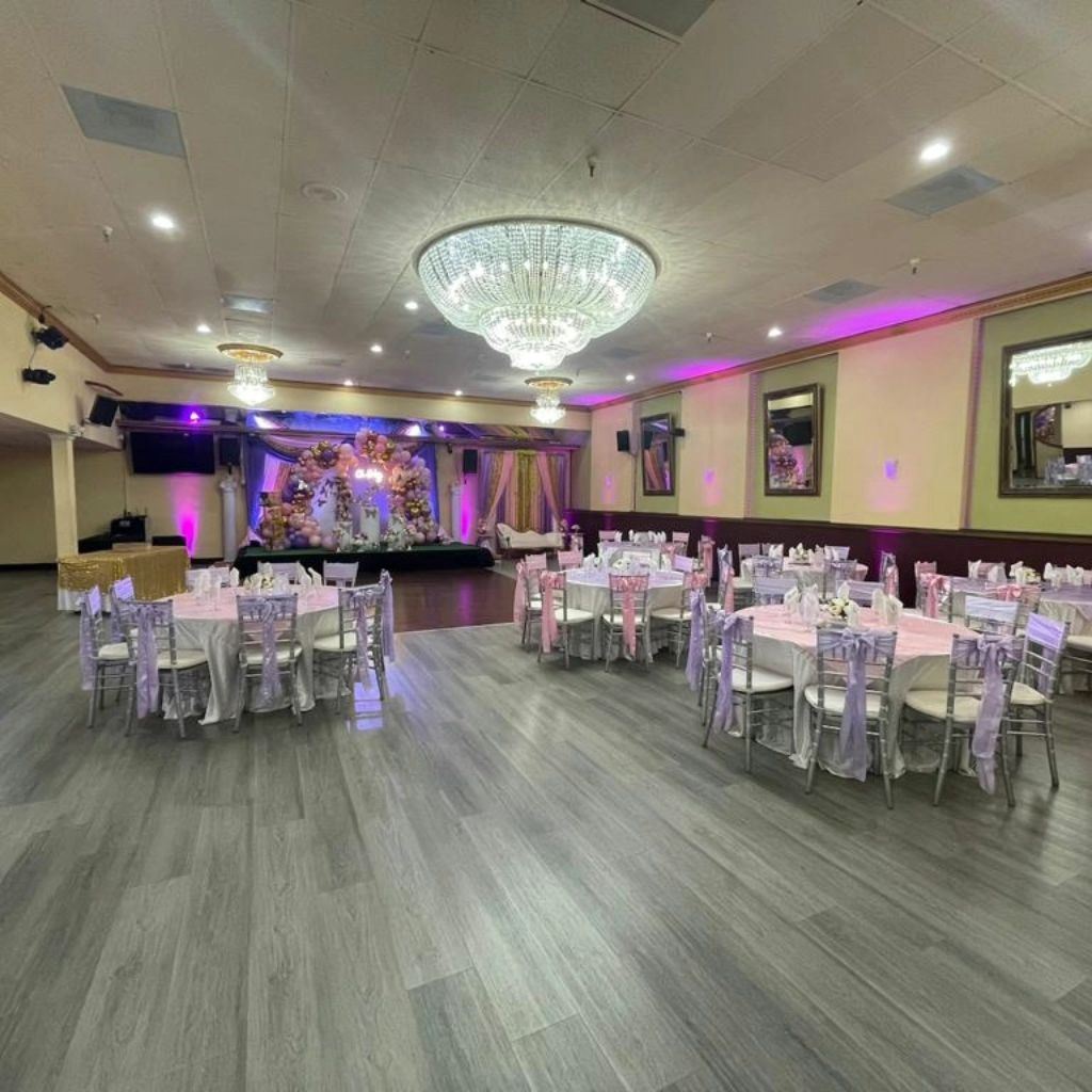At My Royal Palace we accommodate all your planning details. This beautiful building has been fully renovated with modern ambiance, state of the art lighting, custom moldings, wood dance floor, sparkling chandeliers and private dressing room. The hall's decor scheme will be sure to impress your guests..