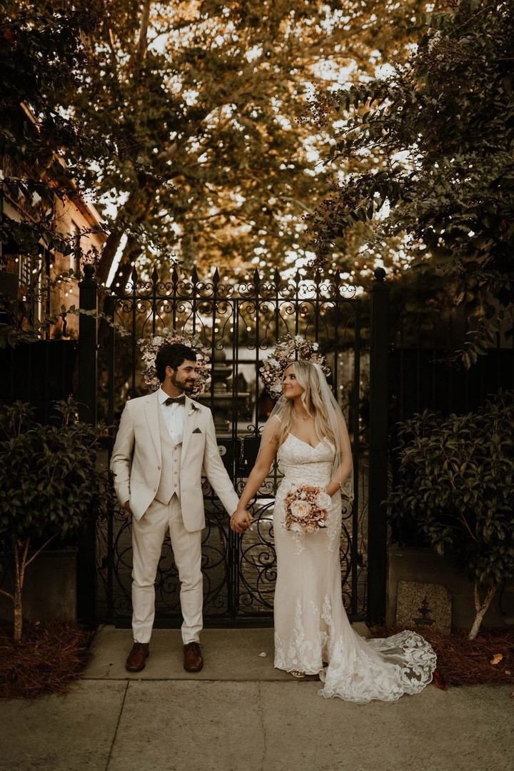 The indoor spaces are part of a 2 story building that was built in 1923 as a wholesale grocery warehouse and a hay storage area. It includes a foyer area that leads into the big assembly area with access to the grooms room, outdoor courtyard and smaller warehouse. The Bridal Suite is upstairs with a beautiful decorative iron stair case that leads down into the courtyard.