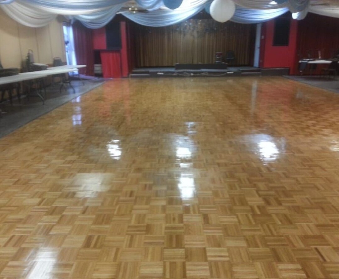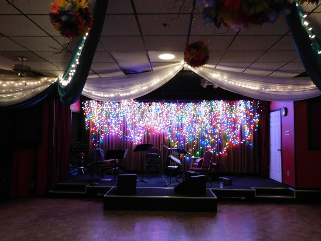The Ernie Mattson Ballroom has a large wood parquet dance floor and a big stage. Round or rectangular tables are available, and our kitchen can provide either a sit down meal or a beautiful buffet. There is also a service bar in the room.