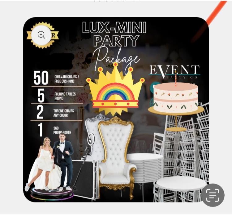 Packages include, ghost or chivari chairs, tables, center pieces, linens, photo booth and event planner. Add ons for balloons, back drops and more available.