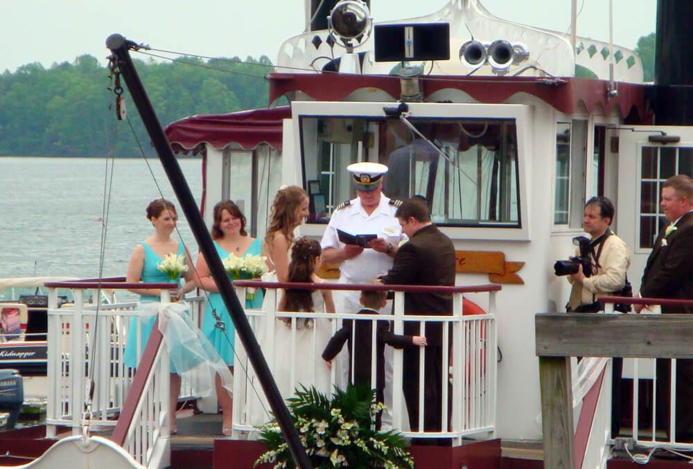 A Wedding doesn’t have to mean a big price! Why rent a stuffy Reception Room or a windowless room in the back of a Restaurant?? Instead celebrate your “special day” cruising Smith Mountain Lake aboard the beautiful Virginia Dare Cruise Boat!