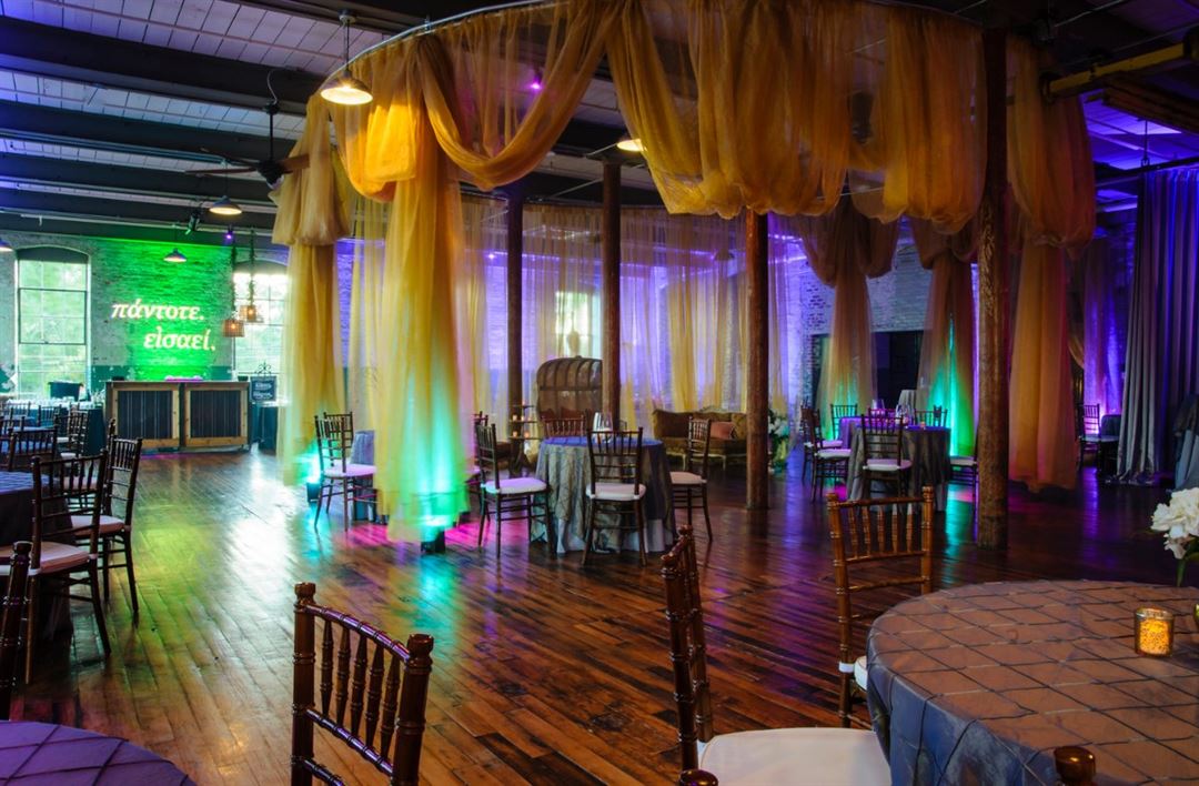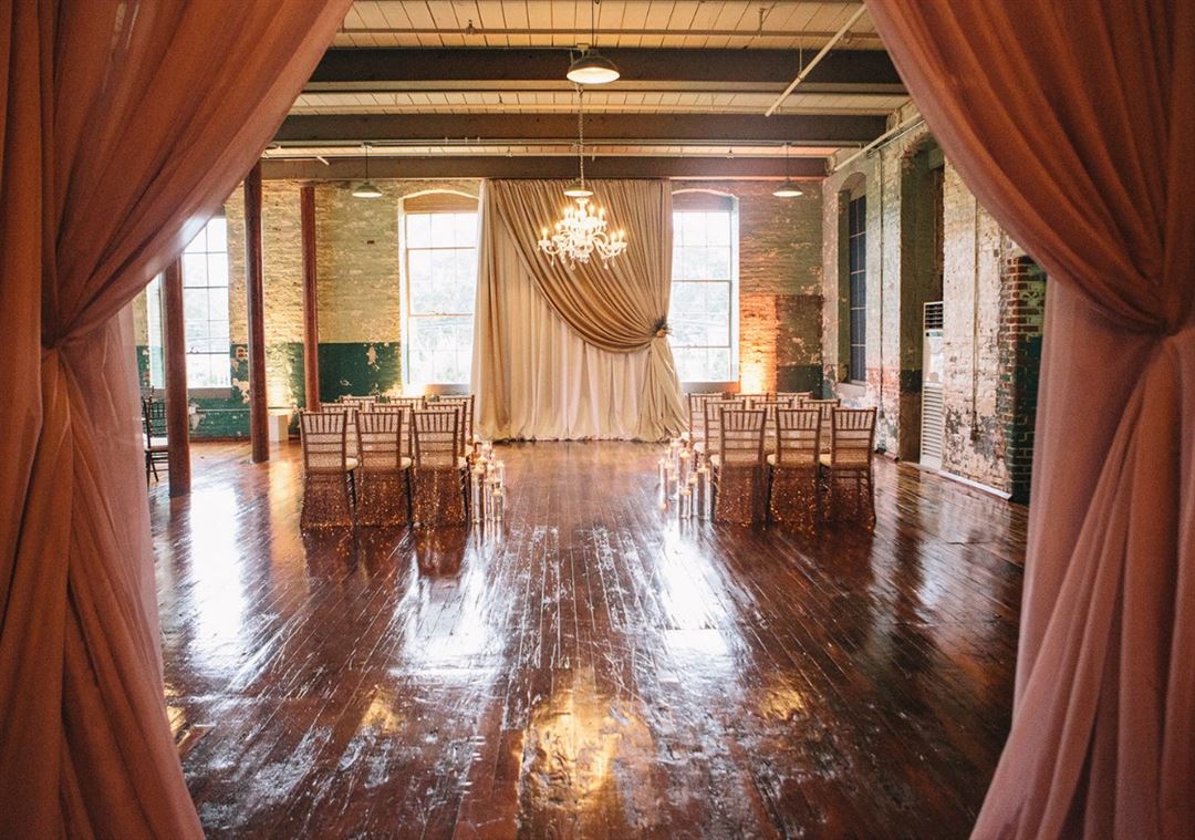 The Engine Room is a unique event venue located in historic downtown Monroe, GA in part of the Monroe Cotton Mills that housed the engines that ran the mill machinery during its 90 years of operation. The building, a part of Monroe’s history since 1895, has been restored and kept intact, including the hardwood flooring, exposed brick walls with weathered paint, heart of pine columns, iron bars covering a few of the windows and main entrances with original sliding fire doors. Modern conveniences such as a full service commercial catering prep kitchen, updated industrial chic restrooms and a large bridal suite make this fully accessible, climate controlled space one of the largest in Walton county. The 6,400 sq ft main hall of The Engine Room can host parties of up to 400 seated or 500 standing guests, yet can be divided allowing smaller events to host both the wedding ceremony and the reception in the same room. The expansive outdoor lawn provides an acre and a half of green space for ceremonies, parties and picnics with the historic brick mill building, with its accompanying towers serving as a picturesque backdrop. The Engine Room also features a outdoor patio, tucked away for a private open-air atmosphere for receptions and small ceremonies.