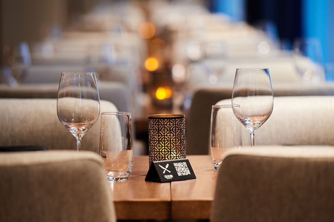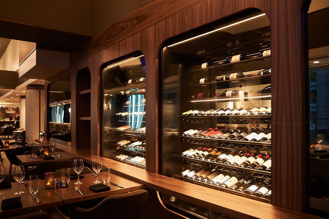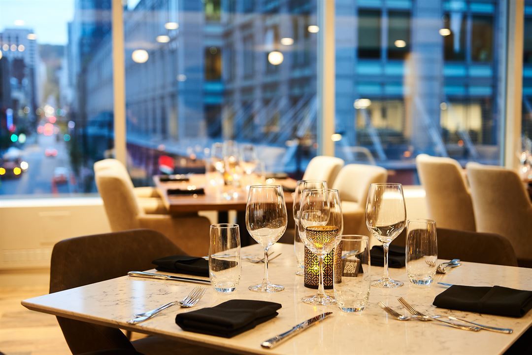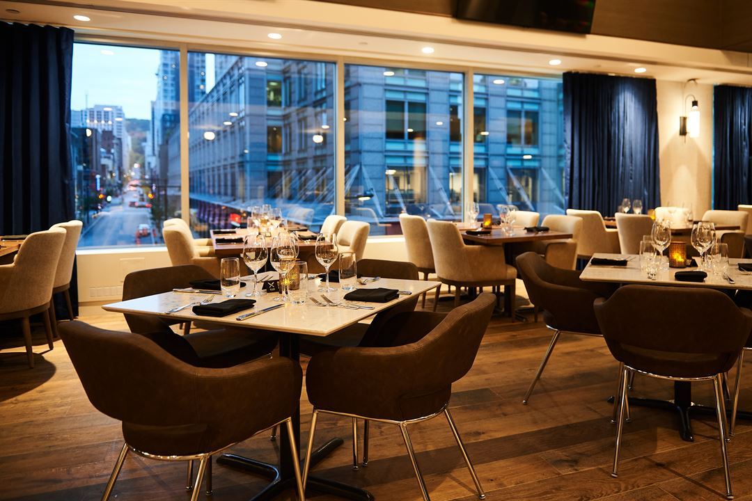 With 110 feet of windows, natural light brightens up this room like nowhere else. Gold-framed pictures of moments celebrating the Canadiens hockey dynasty complement the setting, while an extensive array of suspended television monitors are featured throughout the space.