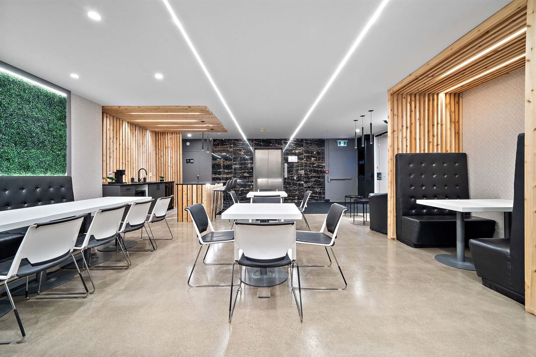 The lounge is equipped with bar height tables and dividing walls, Sonos synchronized speakers and 4 large smart TVs great for presentations or entertainment. We also have a beautiful kitchen area equipped with coffee makers, a large sink, fridge, microwave and more. We have 3 washrooms onsite.